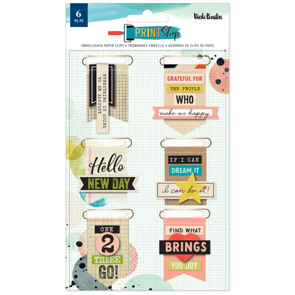 This package contains Vicki Boutin Print Shop Layered Paper Clips, six pieces.