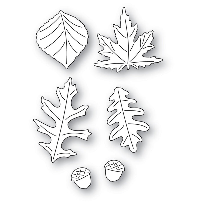 Steel craft die for use on cardstock, felt, fabric, shrink plastic and more. Cut, stencil, emboss. 1 x 1.1, 1.3 x 1.3, 1.1 x 1.7, 0.8 x 1.3 inches leaves, (2) 0.4 x 0.4 inch acorns