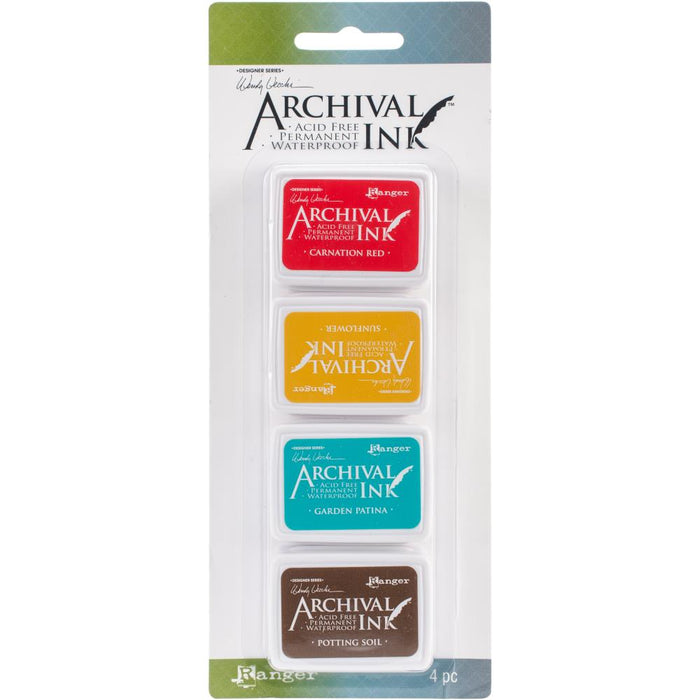 Archival inks will not deteriorate paper or photos and will not bleed when painted over with watercolours, or water-based ink. Ideal for stamping on alchohol-ink backgrounds. Non-toxic, acid free, fade resistant, with a raised stamping surface. Pack of 4 mini ink pads - carnation red, sunflower, garden patina, potting soil.