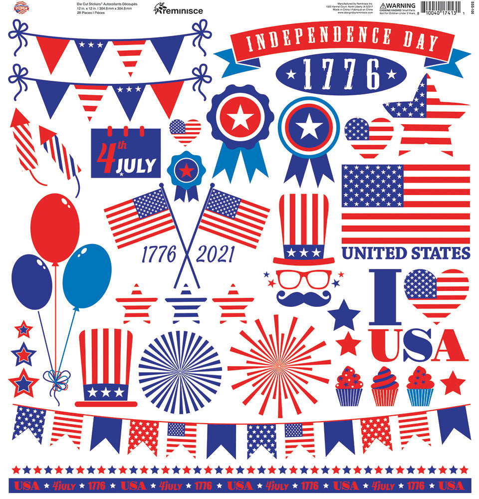 This 12" x 12" sheet of stickers is just oozing with patriotism. This sheet is from the Star Spangled Spectacular Collection from Reminisce. This sheet contains 28 separate pieces, it is full of red, white and blue banners, stars, hearts, fireworks, border pieces, balloons, fire crackers, and all things used in our 4th of July celebrations.