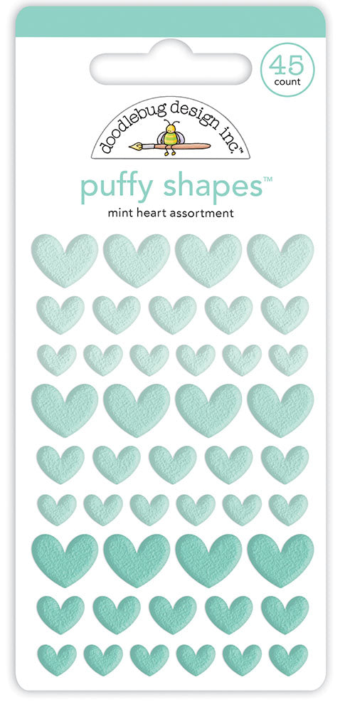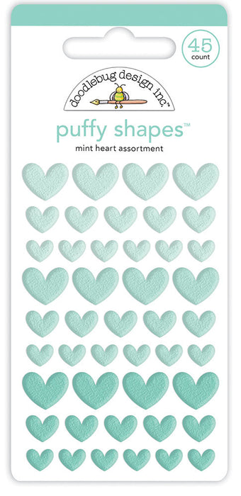 This package of 45 Puffy Shapes Stickers, Ladybug Heart, is part of the Monochromatic Collection from Doodlebug Design. These hearts are self-adhesive stickers, there are three color variations within the set, and there are three sizes of hearts.