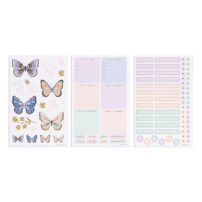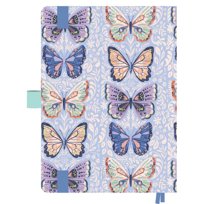 Adding journaling to your routine is proven to help with managing stress and promoting overall wellness. This bullet dot grid journal features dot grid pages that provide the perfect blank slate to begin your journaling journey. 80 page cool-toned butterfly themed notebook ideal for most pen types. High-quality 160gsm paper will prevent ink from bleeding and ghosting. 3 sticker sheets to create custom page spreads. Pen loop to hold your writing utensil. Dimensions 5.625 x 8 inches.