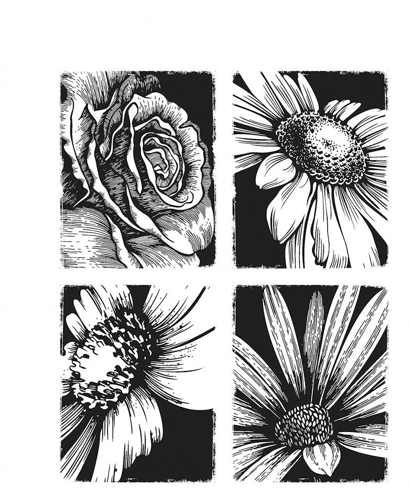 This package of four red rubber cling mounted rubber stamps, Bold Botanicals, is designed by Tim Holtz for Stampers Anonymous. These stamps measure approximately 2.625" x 3.375" and feature red rubber mounted on a 0.125" gray static cling cushion which provides accurate positioning, easy repositioning, and is thin enough that storage is not a problem. All of these stamps feature large floral close-ups.