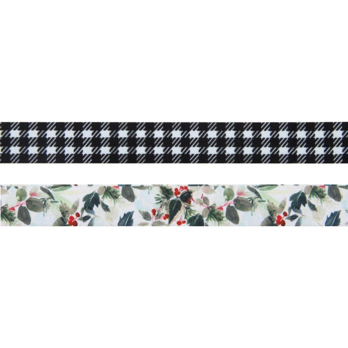This package contains two 3 yard rolls of .75 inch wide fabric tape in assorted Christmas designs.