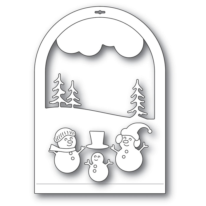 Dies are approximately 3 x 4.3 inches backer, 2 x 1 inch cloud, (2) 0.9 x 0.9, 0.6 x 0.7 inch snowmen, 0.6 x 0.4 inch earmuffs, 0.6 x 0.2 inch scarf, 0.5 x 0.4 inch top hat, 0.5 x 0.3 inch cap, 0.6 x 0.5 inch bonnet.