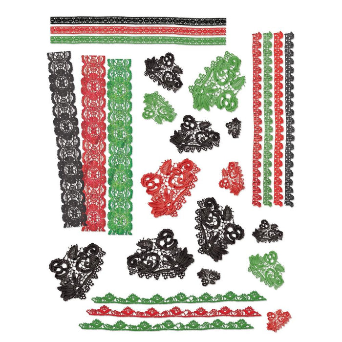 The Christmas Spectacular Lace Laser Cut Elements pack from the includes a total of 27 pieces. These printed and cut lace strips and pieces are an ideal additional to any project without the bulk. Precision cut elements can easily be removed by releasing the tiny tabs which secure pieces to the sheet. This package contains four sheets of 6x12.5" heavyweight cardstock.