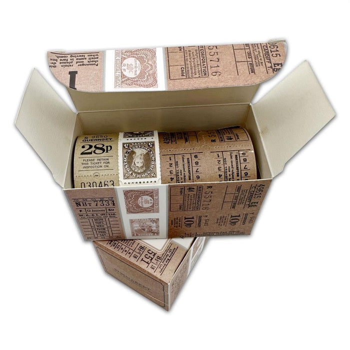 Ticket Essentials are the perfect addition to any project. The vintage ephemera pieces are die-cut to create various ticket shapes and sizes. Bend at perforation and careful tear apart for countless pieces. Each box contains a total of 3 rolls in coordinating shades, 5 meters each roll. One roll is perforated stamps (22mm wide). Two rolls of tickets (22mm and 46mm wide). Color Swatch Tickets have double-sided printing for added variations and options.
