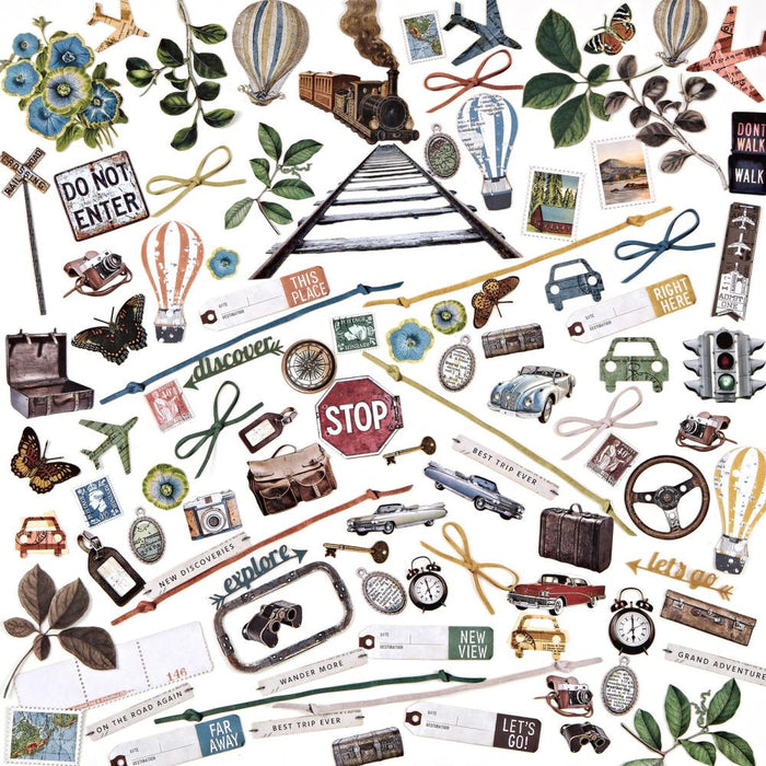 101 laser cut elements included on four 6x12.5 inch sheets. Precision cut elements of foliage, transportation icons, florals, butterflies, borders, bows, postage stamps, baggage, arrows, frames, tags and more.