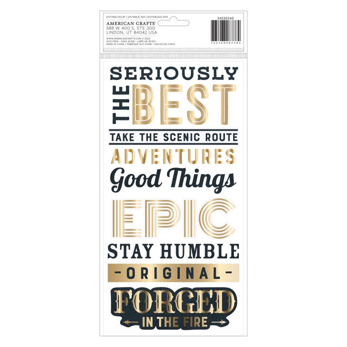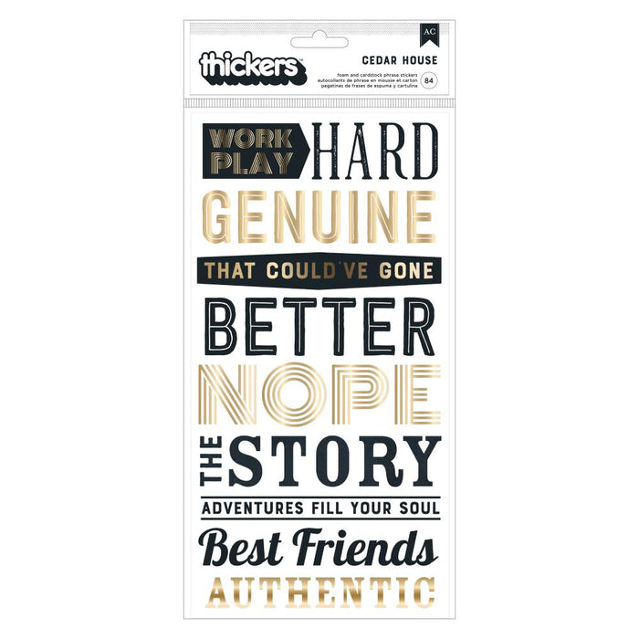84 foam and cardstock phrase thickers on two sheets measuring approx 5.5"x11".