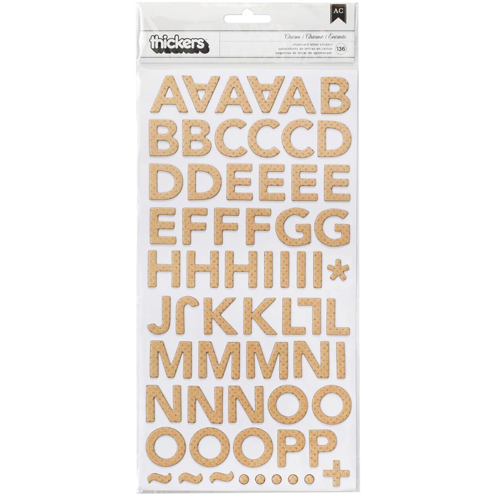 Chipboard letter stickers with gold foil accents. Uppercase, approx 1" tall. 136 pieces.