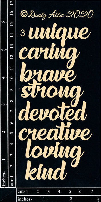 Laser cut chipboard, approx 5.75"x2.75". 8 pieces each word approx. 2.7"x0.8"