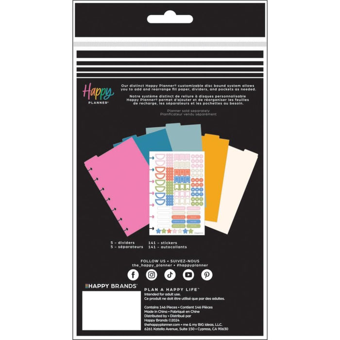 Get organized and keep planning with these Bright Day plastic dividers. Add them to any Mini size planner, notebook, or guided journal. These planner accessories can divide your plans into categories or replace your current dividers with these sturdy alternatives. Use the provided high-quality stickers to label your dividers! 5 multicoloured Mini size plastic dividers wtih tabs at the top. 1 sticker sheet with 141 stickers for flagging reminders, making lists, and adding notes. Extra pages not included.