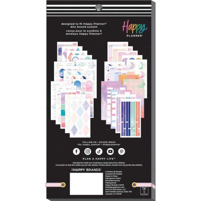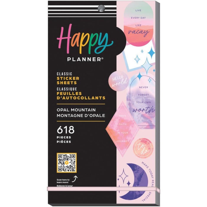 This Opal Mountain sticker book features celestial imagery and jewel tones artwork. Make plans that work with our special stickers designed specifically for our products. Add inspirational sticker to your layouts or notes and make planning an expression in creativity. Your Happy Planner is the starting point for your biggest goals and wildest dreams! 30 sheets, 618 pieces.