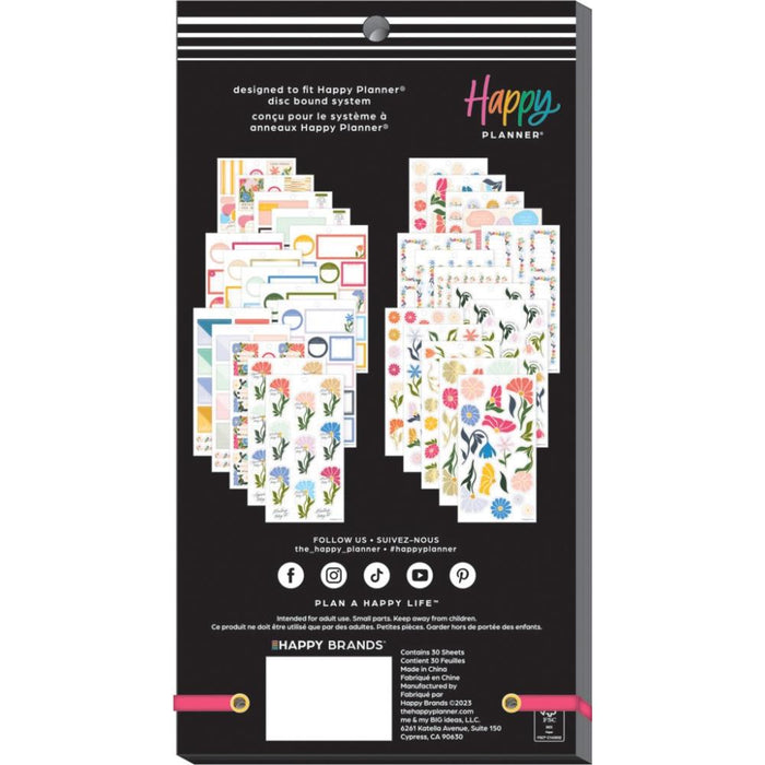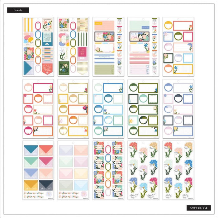 This Poppy Piping sticker book features warm colors and bright flowers. Add fresh floral stickers to your spreads for extra function and a personalized appearance. Use the strips of floral washi tape for interesting accents and never miss a meeting with reminder and quick notes. Add these summery stickers to any Happy Planner, notebook, or bullet journal. Never stop making big ideas! 30 sheets, 474 pieces.
