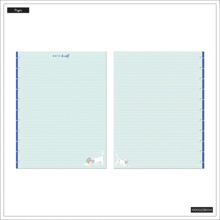 Create notes to yourself with this Purrfect Seasonal Cats theme notebook with designs by guest artist Krissy Mast. The dotted lined pages feature a blue background, and cute kitties in the corners. Our notebooks can be used as a journaling space or an organizational tool to maximize your everyday productivity! 60 page Purrfect Seasonal Cats notebook in the Big Happy Planner size. Double-sided dotted lined paper for your to-dos, daily memos, or reminders. 3 printed dividers that can be categorized to your preference. Sturdy laminated covers and mini discs. Dimensions: 8.5 x 11