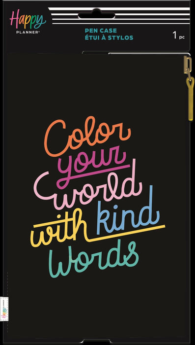 This canvas pouch features multicolored lettering with the message “Color your world with kind words” against a black background. The back has colorful stripes. The pouch has a pink black band that wraps around your Happy Planner cover. The zip closure will keep your pens, sticky notes, and washi tape safe!