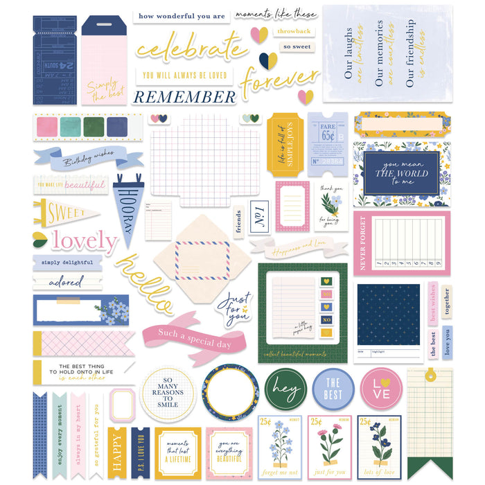 This set of cardstock diecuts is full of sentiments and journaling pieces that form part of the Forget Me Not collection. You will receive a wide variety of sentiments to help capture the feeling of your next project, along with tags and journal spots to record your memories or mix with other pieces. You will receive 148 pieces (2 pieces of each shape) that have gold foil accents. Made from 180gsm weight cardstock that is acid free.