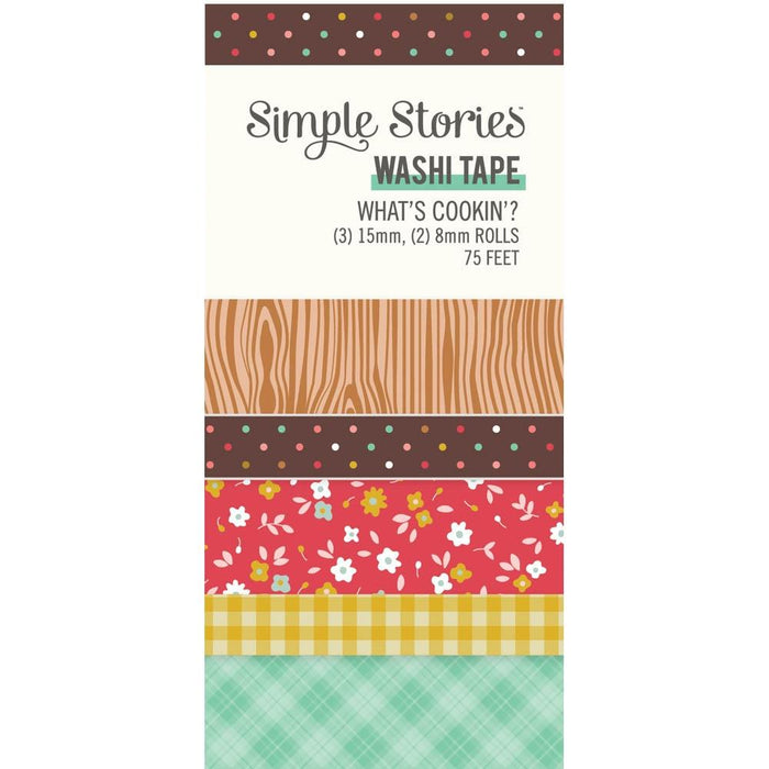 5 reels of washi tape, 3 approx 15mm wide each, 2 approx 8mm wide each. 75 feet in total.