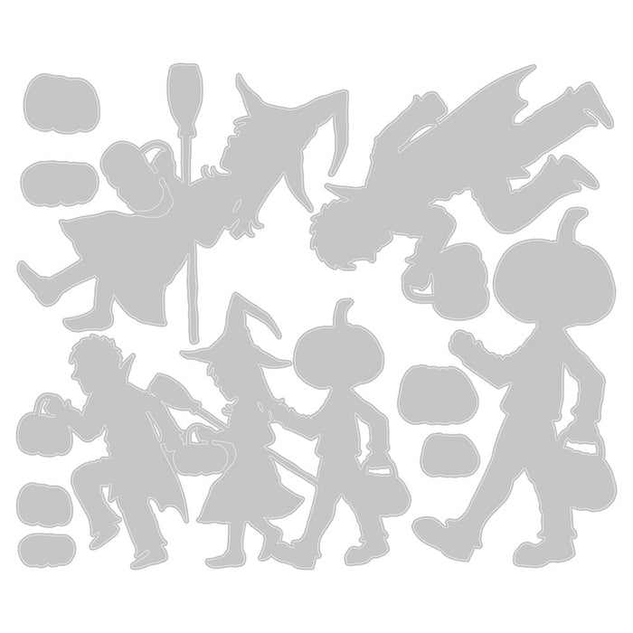 This 10 piece Thinlits Die set, Halloween Night is designed by Tim Holtz and is part of the Halloween Collection for Sizzix. This die set features three silhouettes of Halloween characters in two sizes, a pumpkin head, a witch, and Dracula, as well as their treat bags. These dies are compatible with leading die cutting machines (sold separately). These dies can be used for invitations, cards, scrapbook pages, tags, journals, and other paper crafting projects.