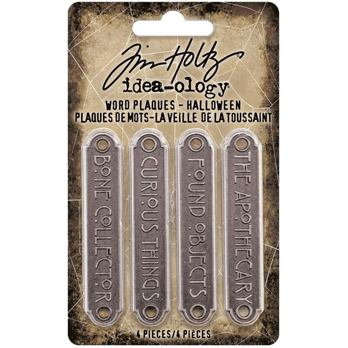 Tim Holtz Word Plaques for Halloween are pre-stamped metal labels that feature a different quote on each. Simply adhere or use Tim Holtz Fasteners for a creepy label onto your next Halloween craft. 4 pieces. Elements measure approximately 2.38 x 0.88 inches