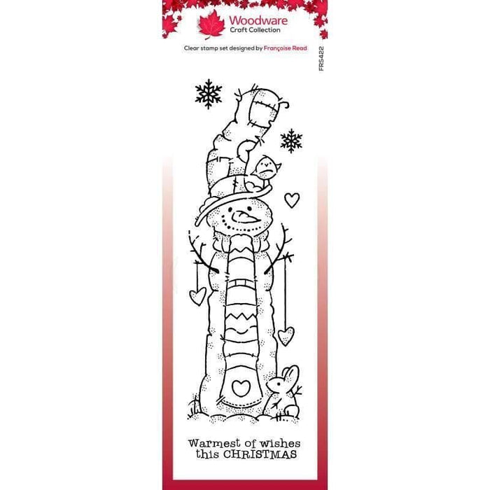 This is a 5 stamp set from Woodware including the snowman, a little heart, 2 snowflakes and the words "warmest of wishes this christmas". The stamp size is 8x2.6". Designed by Francoise Read.